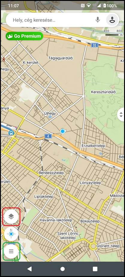 1. A bal alsó sarokban található gombok segítségével kiválaszthatjuk a térképi rétegeket (pirossal jelölve), illetve beléphetünk a főmenübe (zölddel jelölve)