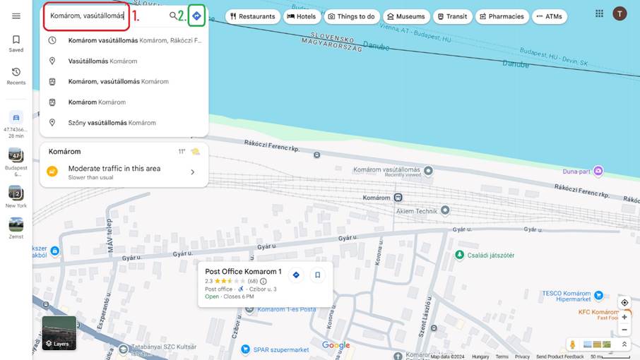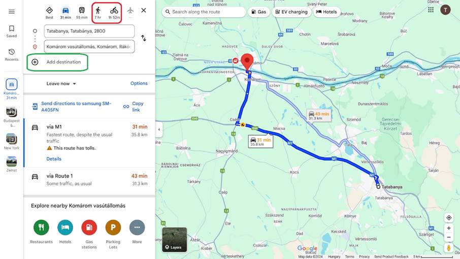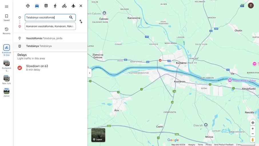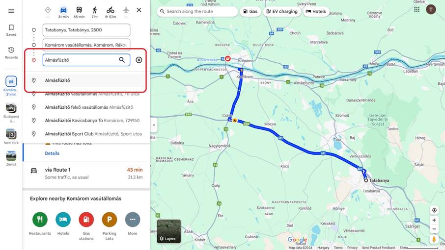 - a keresőbe gépelve az adott település nevét általában több opció is megjelenik; az Által-ér menti túránál maradva Tatabánya vasútállomás és Komárom vasútállomás közé tervezzük az útvonalat