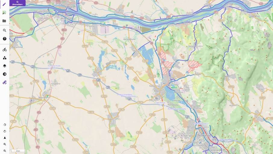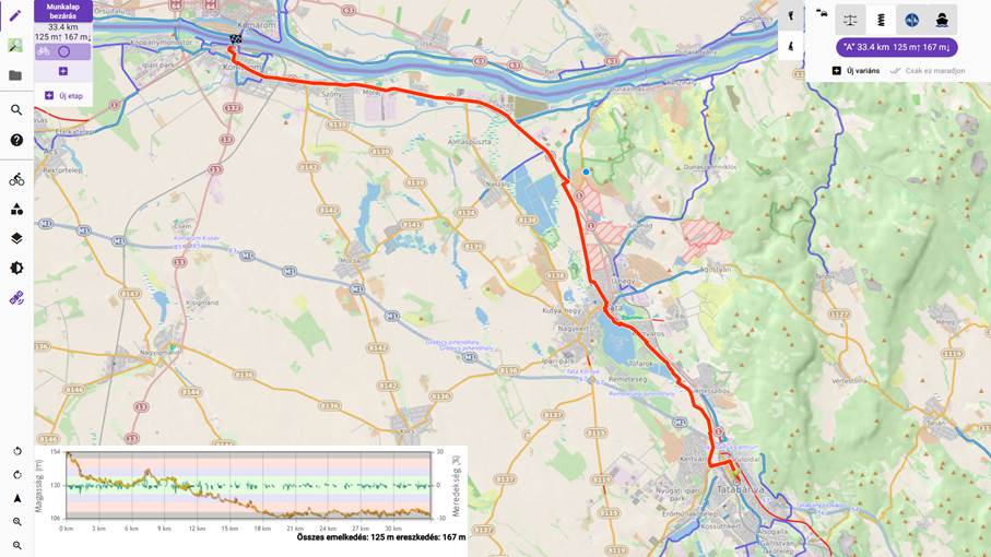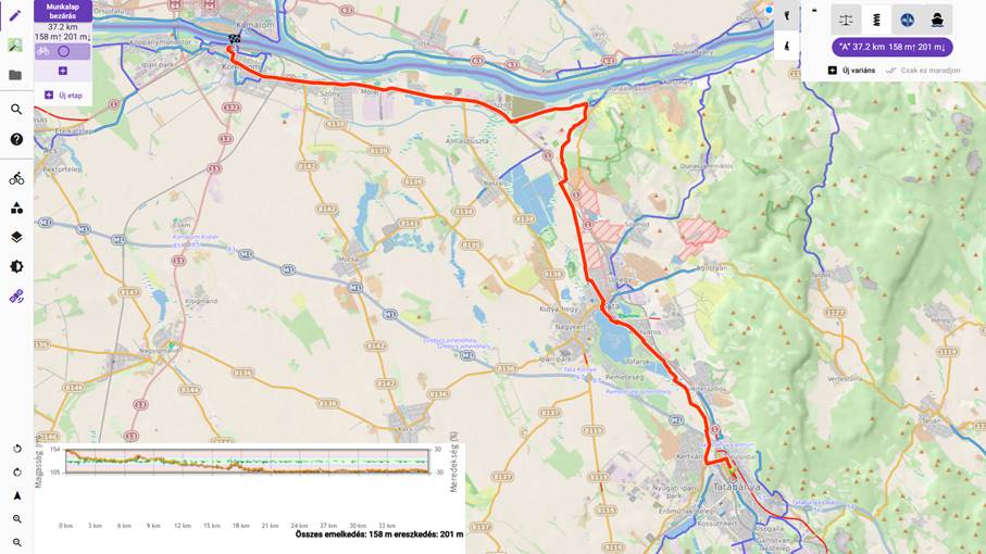 - Az útvonalra kattintva a bal egérgombbal, a gombot nyomva tartva az útvonal áthúzható tetszőleges helyre. Esetünkben – amennyiben ismerjük a fent említett kerékpárutat – a Tatabánya és a Tata közötti útvonalat érdemes úgy korrigálni ezzel a módszerrel, hogy az Által-ér menti kerékpárutat kövesse.