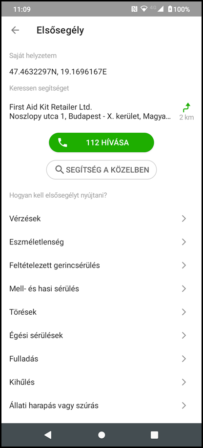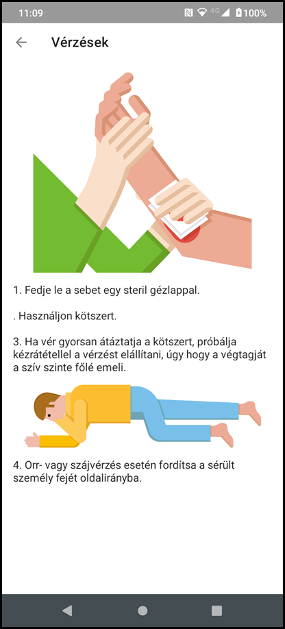 5. Az elsősegély menüpontban különféle sérülések közül lehet választani, amelyeknek kezeléséről egy ábrákkal illusztrált rövid, nagyon egyszerű leírást lehet elolvasni, mindemellett pedig lehetséges a 112-es segélyhívószám azonnali tárcsázása az alkalmazásból.