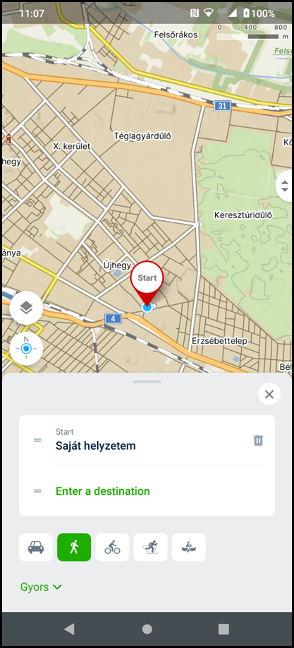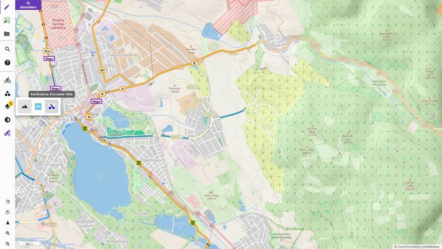 - Szintén jó lehetőség a gyalogos útvonaltervezés opció kiválasztása (bal felső sarokban a gyalogos ikonra kattintással), mivel egyrészt így is el fogja kerülni az útvonal például az autópályákat, másfelől a (gépjármű)forgalom elől elzárt útvonalakat is figyelembe veszi a tervező, azonban arra figyelni kell, hogy ezek mennyire járhatóak kerékpárral.