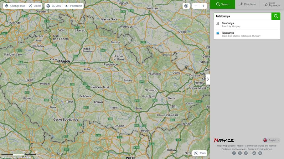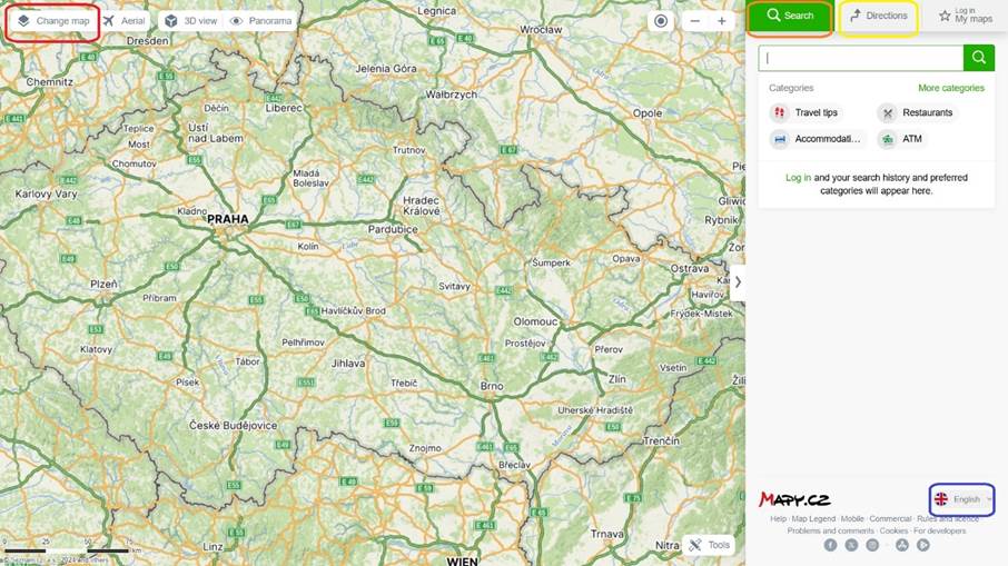 A Mapy – mint nevéből is kitalálható – nem egy magyar fejlesztésű honlap, illetve alkalmazás, ennek megfelelően magyar nyelvű menüvel sem rendelkezik. Ennek ellenére egyszerű a használata, egyrészt mert számos nyelven „tud” (ezek közül a legfontosabb az angol és a német; a cseh, szlovák, lengyel, ukrán, orosz nyelv kiválasztásának lehetősége valószínűleg keveseket érint jelen képzésen), másrészt mert a tervezés alapelvei ennél a térképnél is az eddig bemutatottaknak megfelelőek. Ahogy a merretekerjek.hu, úgy a mapy.cz esetében is a hasznos extra funkciókra fogunk fókuszálni a következőkben.
