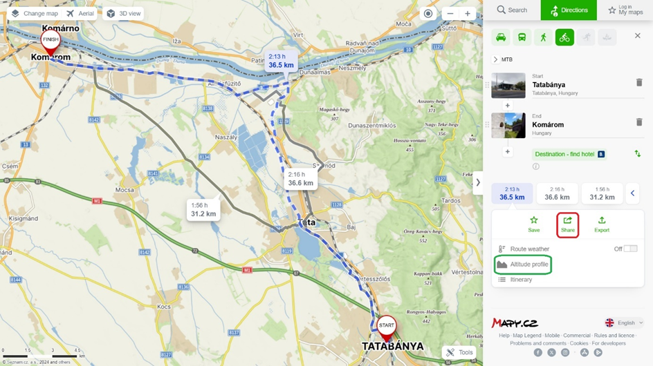 A Mapy térképe (MTB beállításban) elsőre az általunk elképzelt útvonalat rajzolja meg: https://en.mapy.cz/s/mesogopege. A kész útvonalat meg lehet osztani két kattintással (Share funkció; pirossal jelölve), ahol a link így egyszerűen elküldhetővé válik, illetve meg lehet tekinteni a tervezett útvonalhoz tartozó szintrajzot egy kattintással (Altitude profile; zölddel jelölve). Az összesített szintemelkedést mindig érdemes ellenőrizni, mert bár az esetek túlnyomó többségében hihetünk az adatoknak, néha szemmel láthatóan hibás a számítás.