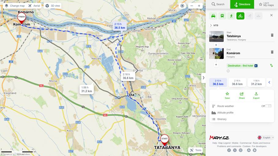 Tatabánya-Komárom a merretekerjek.hu tervezésében – érdekes, hogy a dunaalmási kitérőt nem tervezi be, inkább az 1-es útra viszi a bringást, ez azonban kiküszöbölhető egy extra funkció bekapcsolásával. Az első változat ide kattintva tekinthető meg: Tatabánya-Tata-Komárom