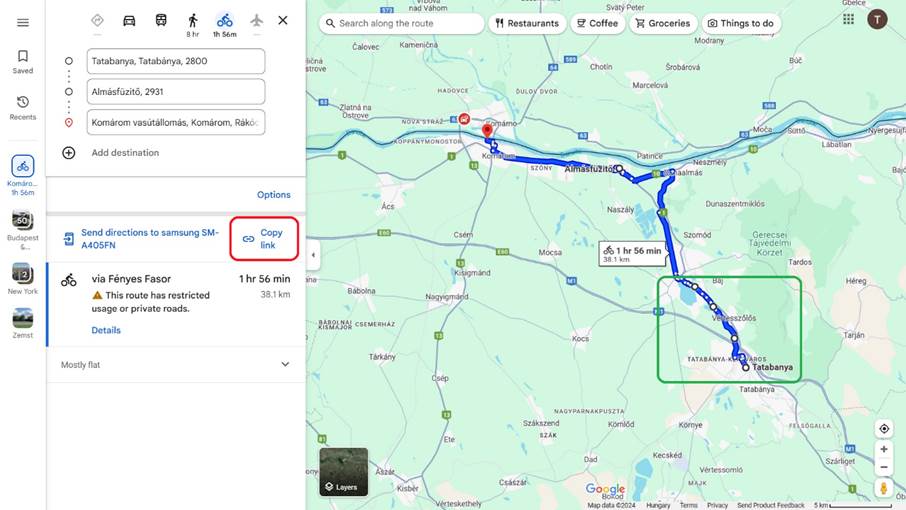 - Útvonaltervezés ellenőrzése – esetünkben (mivel az alapértelmezett beállítás az autós tervezés) a Google térkép az autópályára tervezte az útvonalat, ami kerékpárral természetesen nem járható megoldás, így ezt javítani kell (bár a második lehetőségként, halványabb kék színnel jelölt változat megfelelő lehet)