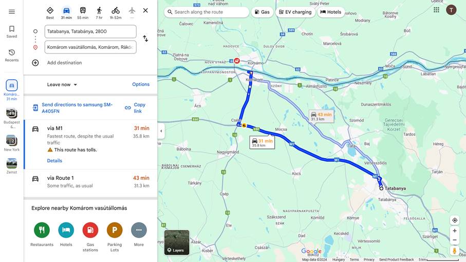 Az alapértelmezett (autós) beállítás szerinti Tatabánya-Komárom útvonalak a Google térképen (4-5.)