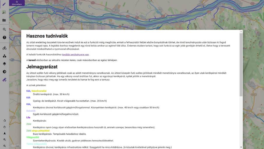 A térképre pillantva rögtön látszik számos kék vonal (az autópályán és a Dunán kívül) – ezek mind valamilyen kerékpáros infrastruktúrát, illetve ajánlott kerékpáros útvonalat jelölnek. Az, hogy pontosan milyen jellegű útszakaszról van szó, a térképre jobban ránagyítva látszik, de abban tulajdonképpen biztosak lehetünk, hogy a kékkel jelölt útvonalakat követve nagyon nem nyúlhatunk mellé. Ugyanez igaz az élénk színű pirossal jelölt szakaszokra, ahol tilos kerékpározni, míg a halványabb piros azt jelenti, ott nem ajánlott kerékpárral közlekedni. (A fenti térképen Tatabánya mellett láthatunk élénkpiros jelölést, ez az 1-es főút, míg a halványpirosra jó példa a Komáromról észak-déli irányban futó 13-as főút.) A teljes jelmagyarázat a bal oldali menüsorban található „?” ikonra kattintva érhető el.