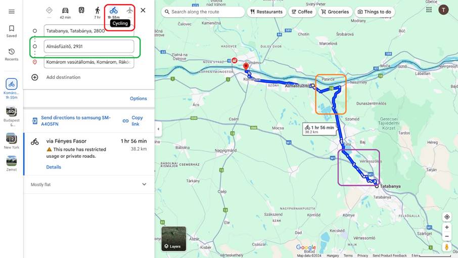Majdnem kész útvonal: kerékpáros útvonaltervezés beállítva, Almásfüzitő köztes megállóként megjelölve, az útvonal Dunaalmás felé a kerékpárutat követi (narancssárga jelölés), azonban Tatabánya és Komárom között még szükséges némi finomhangolás