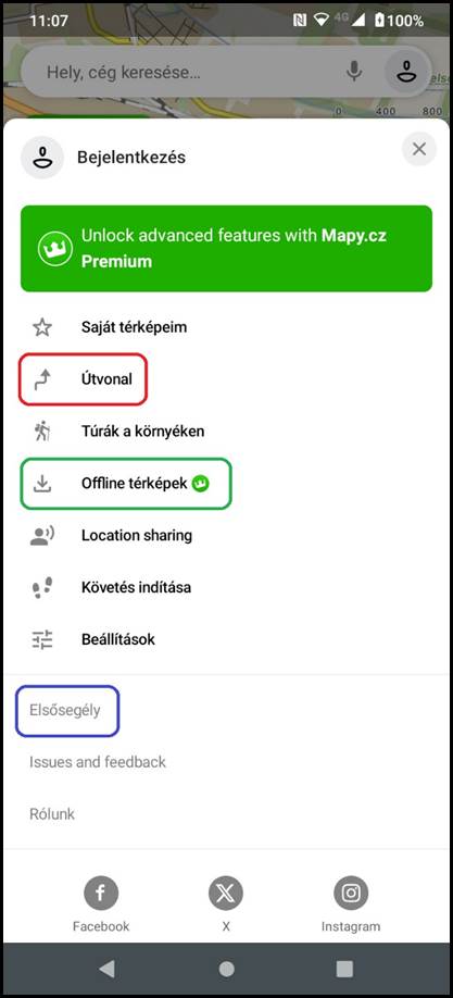 3. A főmenüben három menüpont érdemel különös figyelmet: az Útvonal (útvonaltervezéshez), a Offline térképek (csak regisztrált felhasználók számára érhető el) és az elsősegély.